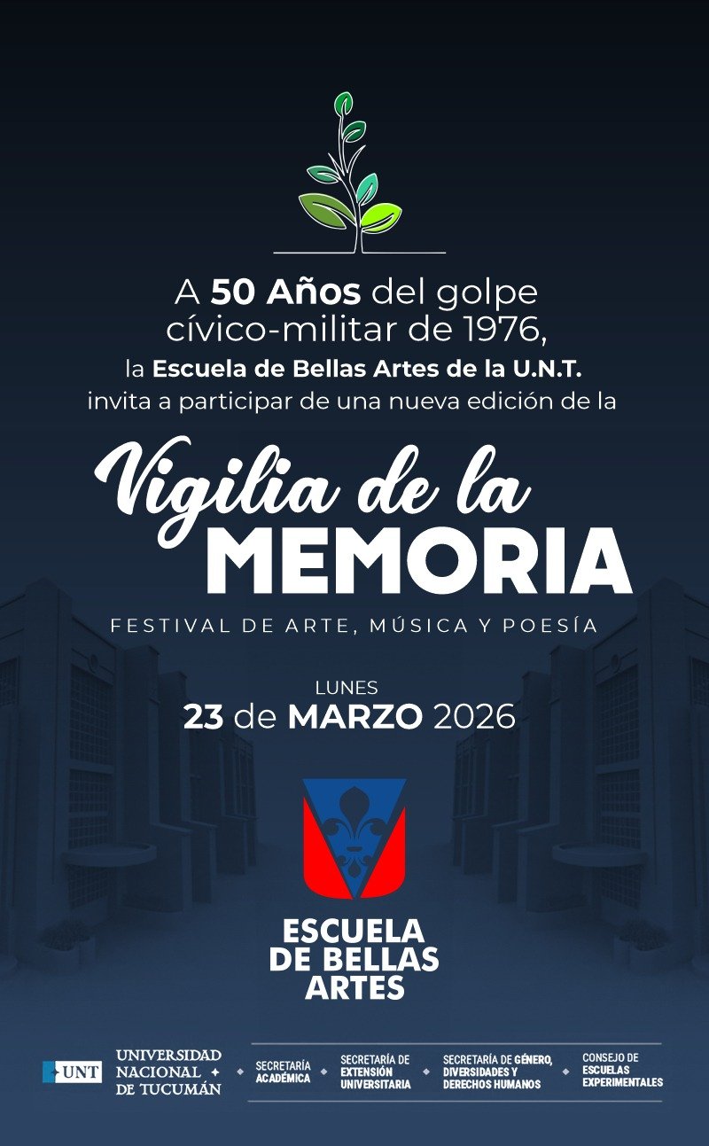 Este 23 de marzo a las 19 hs, la Escuela de Bellas Artes de la Universidad Nacional de Tucumán será sede de una nueva edición de la Vigilia por la Memoria, una jornada que reunirá a artistas, estudiantes, organismos de derechos humanos e instituciones en un espacio de reflexión colectiva, producción artística y participación comunitaria.