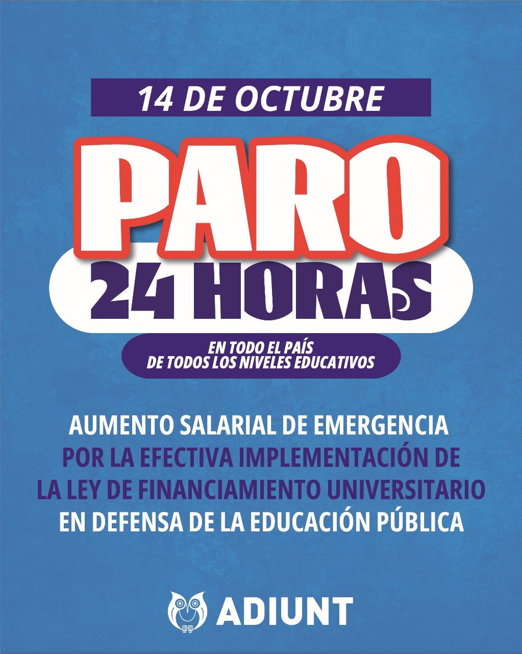 La ADIUNT adhiere al paro nacional docente de 24 horas convocado por CTERA para el próximo martes 14 de octubre, en reclamo de un aumento salarial de emergencia, la reapertura de las paritarias y la efectiva implementación de la Ley de Financiamiento Universitario.