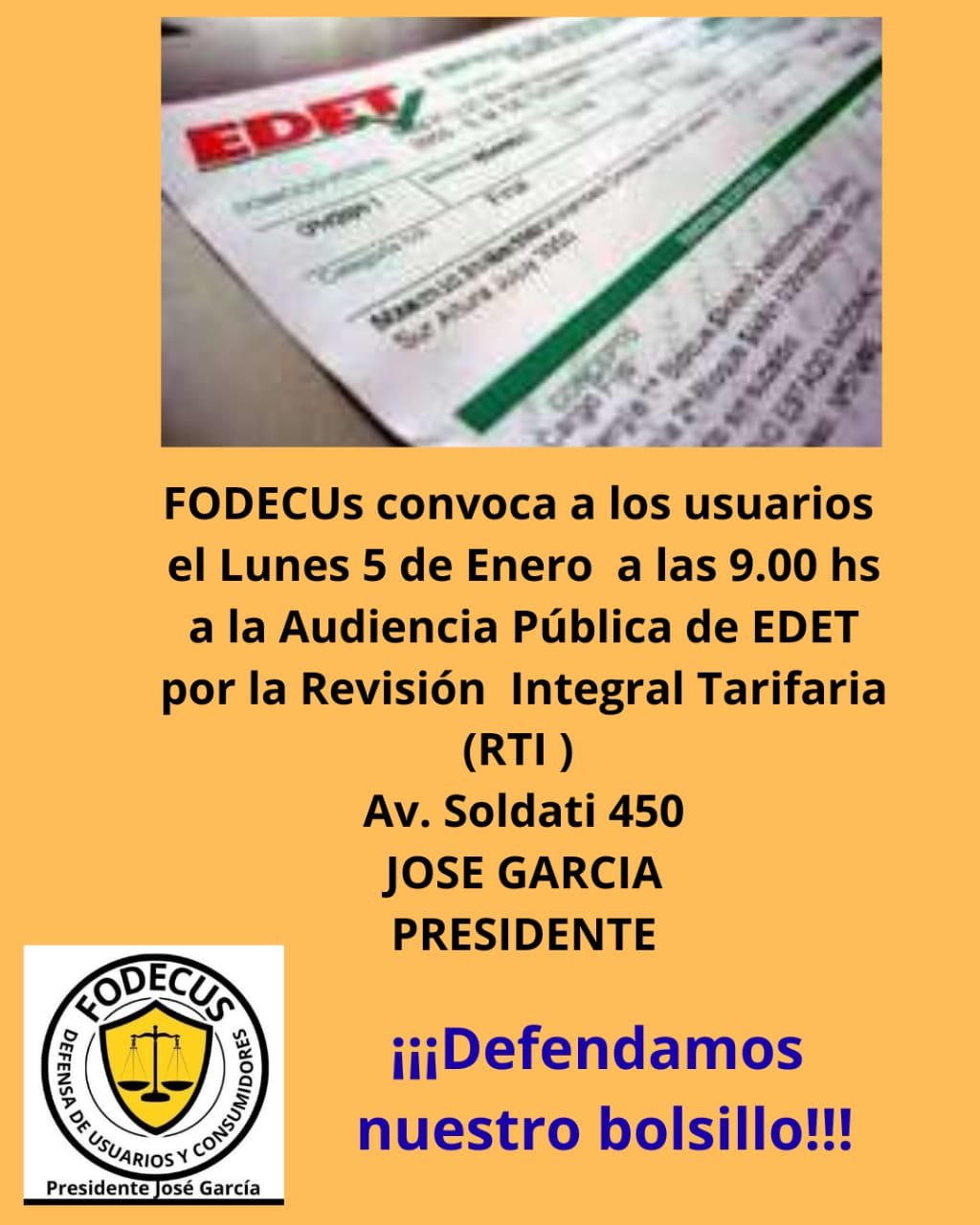 Este Lunes a las 9.00 se llevará a cabo la audiencia pública de EDET por la Revisión Tarifaria Integral en Av. Soldati 450. Por ese motivo FODECUs está convocando a los usuarios que participen para defender su bolsillo. «Basta de aumentos, defendamos nuestros bolsillos» José García, defensor de los consumidores manifestó la preocupación por las irregularidades en esta convocatoria por eso invita a los ciudadanos a alzar la voz y defender sus intereses.