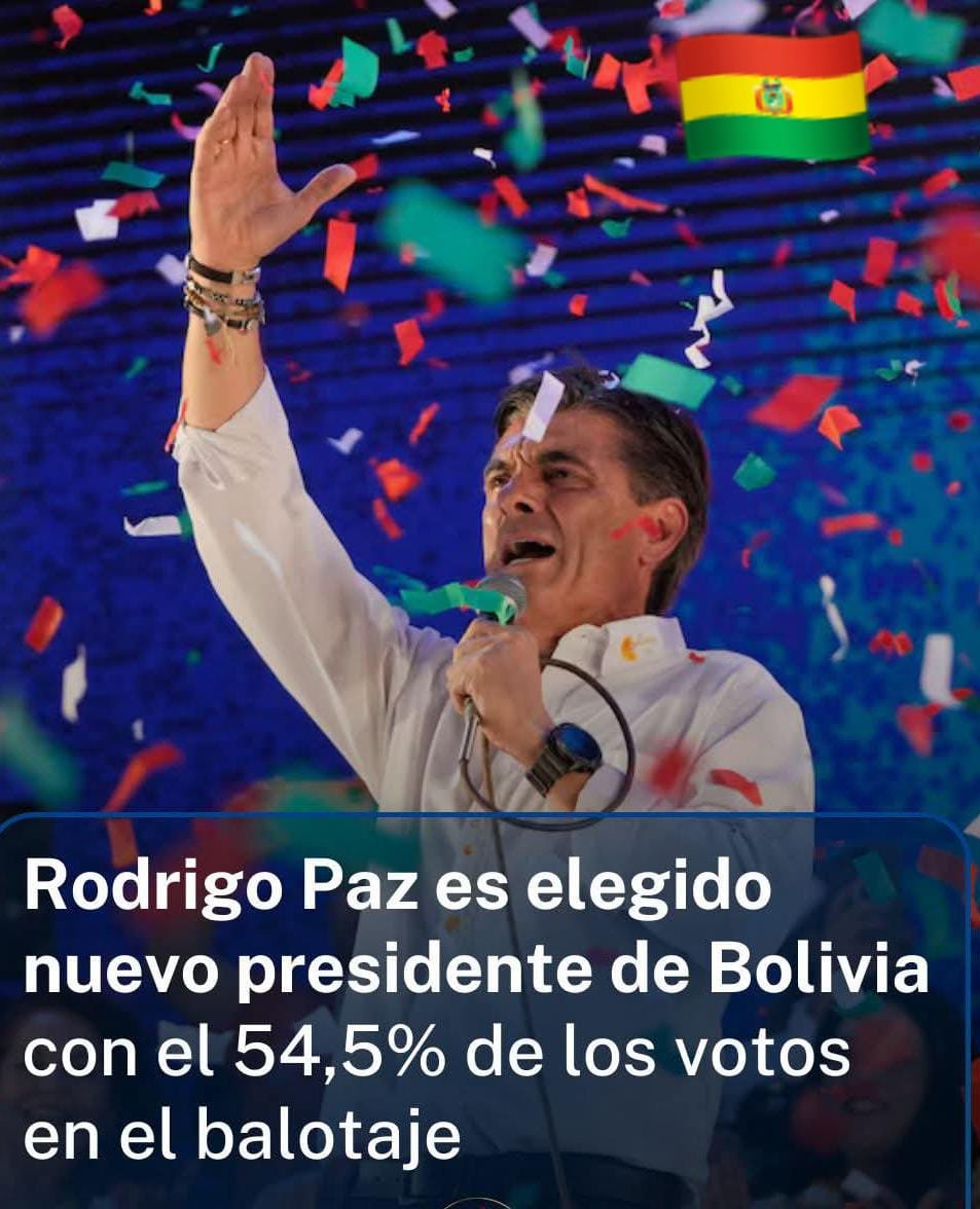 Rodrigo Paz Pereira se impone como nuevo presidente de Bolivia con el 54,53% de los votos, por sobre el 45,47% de Jorge «Tuto» Quiroga, el candidato liberal.