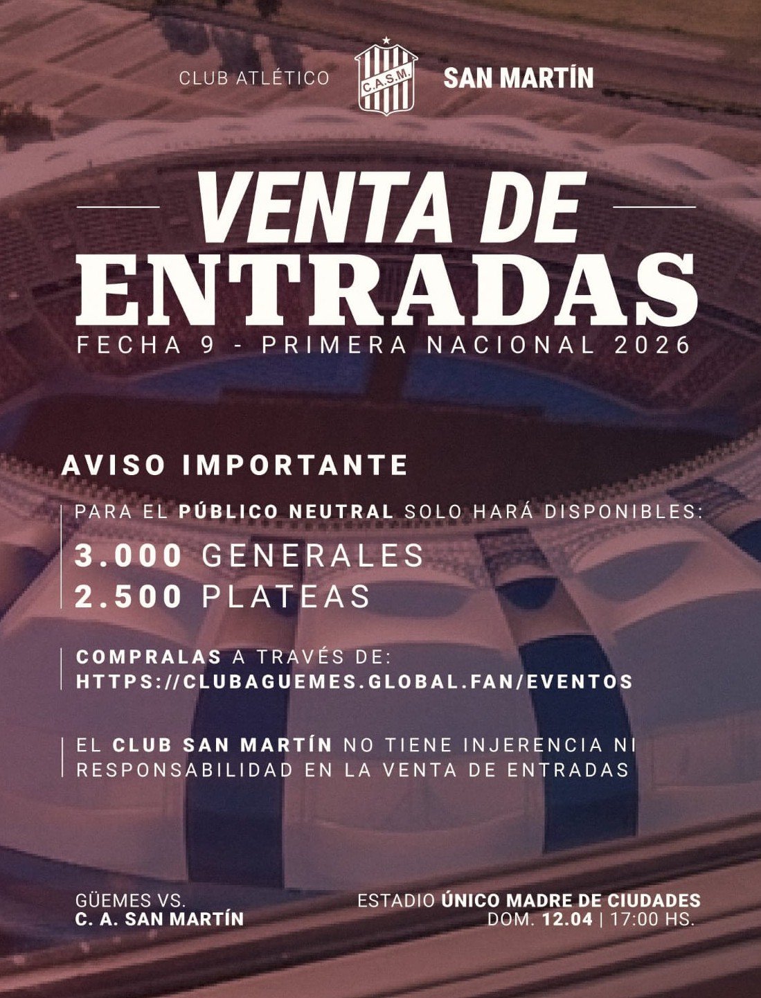 Podra haber publico neutral, la entidad santa no esta a cargo de la venta de entradas, así lo dio a conocer San Martín a través de su pagina oficial y redes sociales.