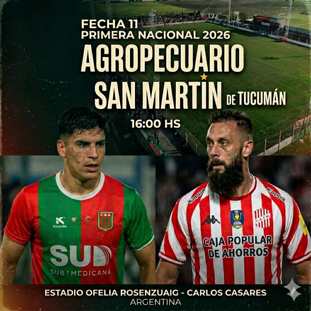 DeportesPortada Fútbol: » El santo quiere ganar en Carlos Casares» 26 de abril de 2026 Redacción San Martín visita a Agropecuario por la fecha 11 de la Primera Nacional 2026. El partido comenzará a las 16hs, en el estadio Ofelia Rosenzuaig.Los de Yllana quieren cortar la racha de empates consecutivos. Comparte esto: Compartir en WhatsApp (Se abre en una ventana nueva) WhatsApp Tweet Compartir en Telegram (Se abre en una ventana nueva) Telegram