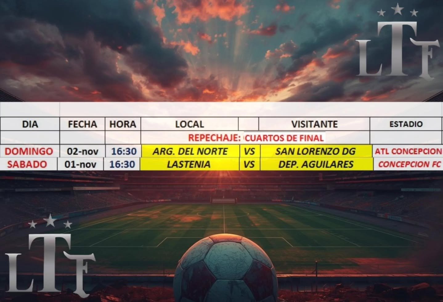 Deportes Fútbol: !Tiempos de definición! 29 de octubre de 2025 Redacción Estos son los partidos programados por la Liga Tucumana de Fútbol, de la zona Campeonato y Repechaje de la División A.Se juegan los cuartos de final.