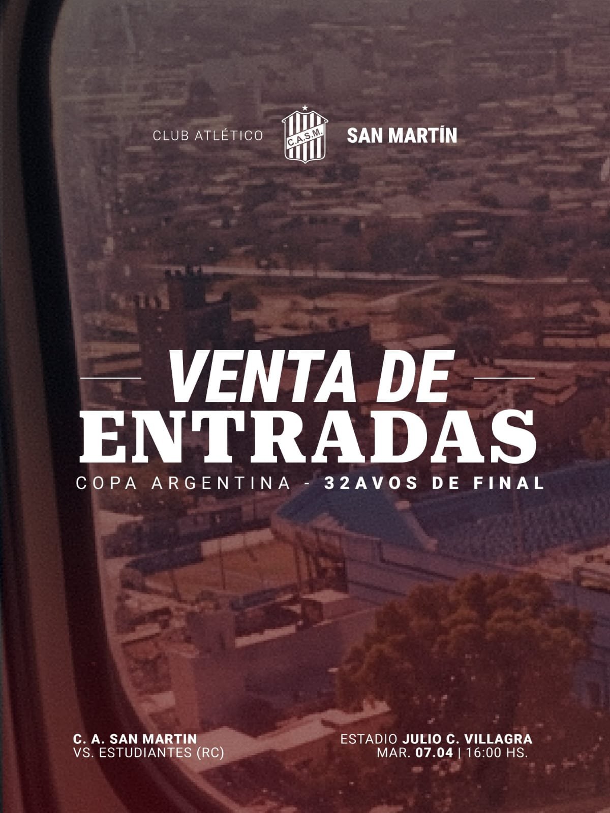 DeportesPortada Fútbol:»Atención cirujas» 5 de abril de 2026 Redacción El club San Martín en su pagina oficial y redes sociales, anunció como será la venta de entradas para el partido de 32avos Copa Argentina ante Estudiantes de Río Cuarto, en el estadio de Belgrano de Cordoba el Martes 7/4 a las 16hs. Comparte esto: Compartir en WhatsApp (Se abre en una ventana nueva) WhatsApp Tweet Compartir en Telegram (Se abre en una ventana nueva) Telegram