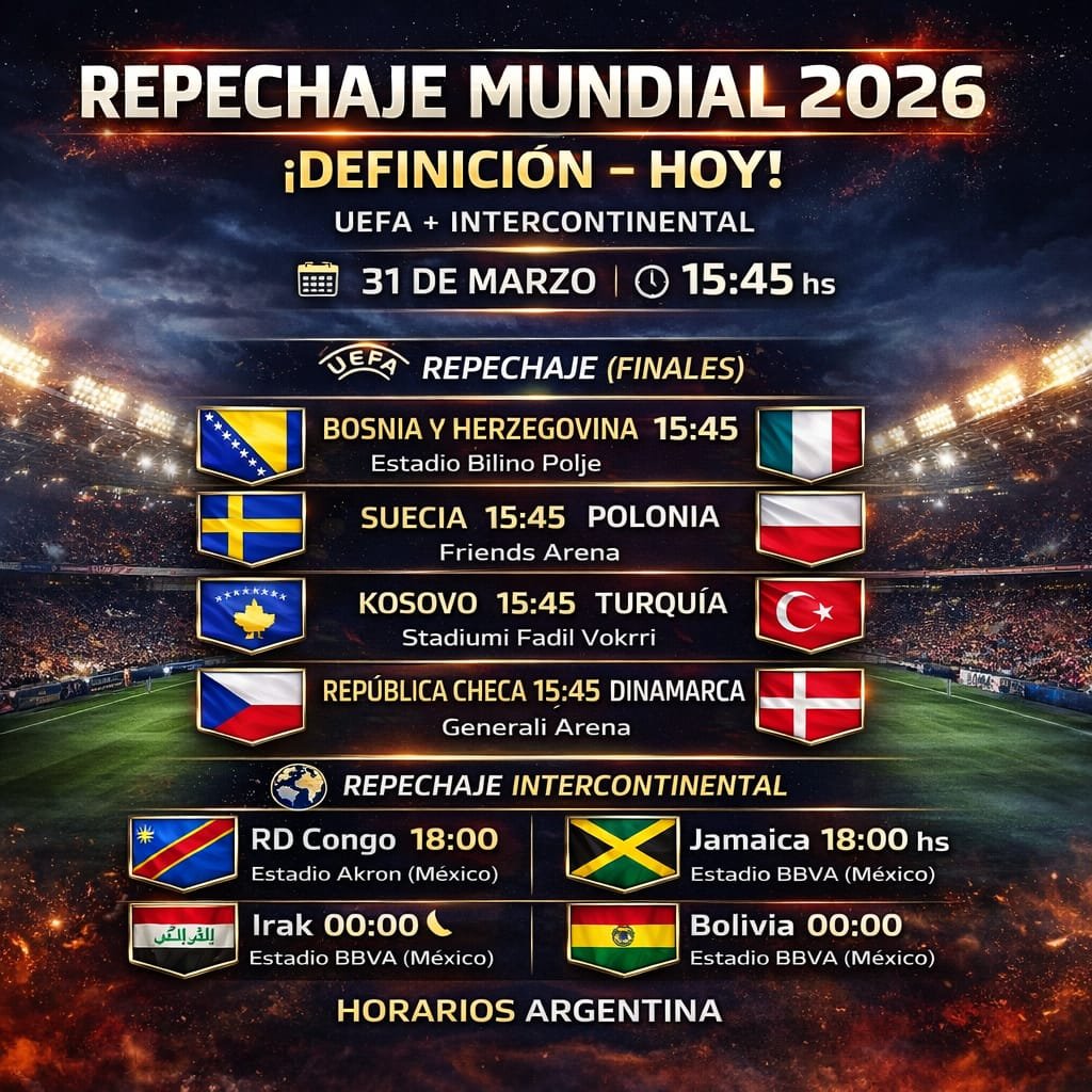 DeportesPortada Fútbol»Doce equipos por seis lugares» 31 de marzo de 2026 Redacción Estos son los partidos que se jugarán para completar los grupos del Mundial 2026.Los 5 partidos de este Martes 31/3 y el partidos de la 00:00hs, del Miércoles 01/4.A todo o nada para estas selecciones. Comparte esto: Haz clic para compartir en WhatsApp (Se abre en una ventana nueva) WhatsApp Tweet Haz clic para compartir en Telegram (Se abre en una ventana nueva) Telegram