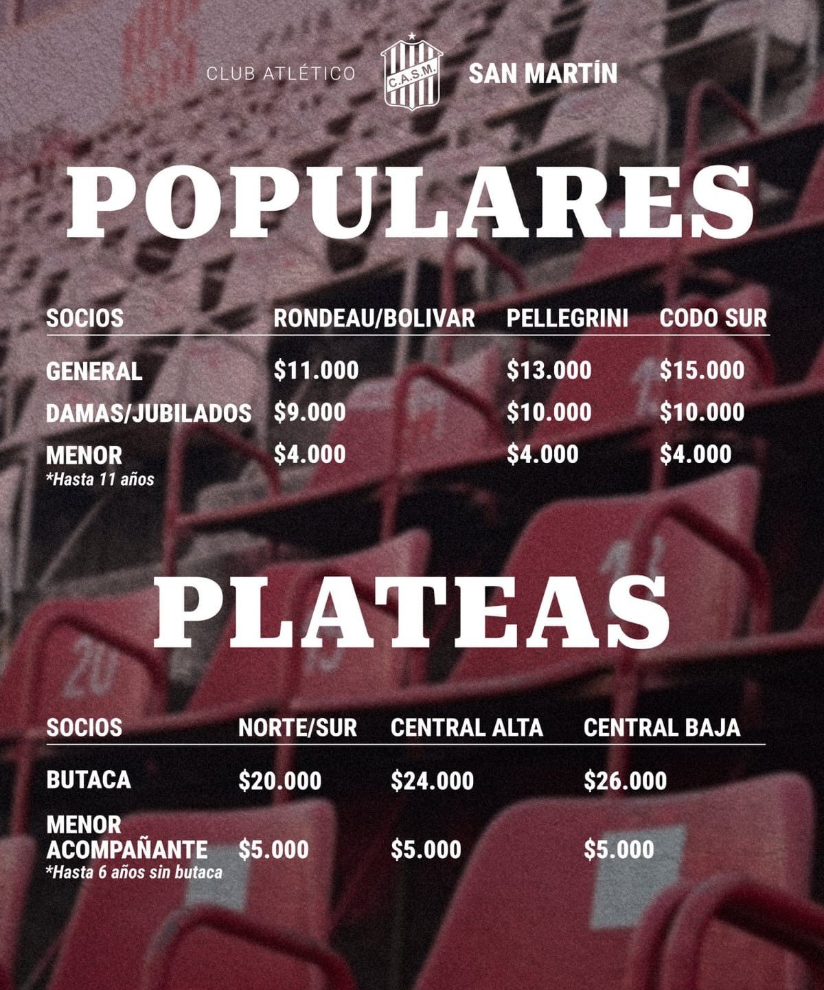DeportesPortada Fútbol»Lo que viene lo que viene» 12 de febrero de 2026 Redacción A dos días del arranque de la Primera Nacional, San Martín a través de su página oficial y redes sociales, dio a conocer el costo de las entradas tanto populares como plateas. Comparte esto: Haz clic para compartir en WhatsApp (Se abre en una ventana nueva) WhatsApp Tweet Haz clic para compartir en Telegram (Se abre en una ventana nueva) Telegram
