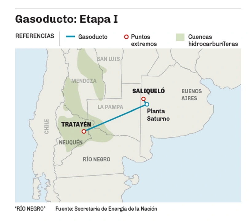 “El ducto tendrá una extensión de 563 kilómetros entre la localidad neuquina de Tratayén y Salliqueló en el oeste de la provincia de Buenos Aires, atravesando Río Negro y La Pampa.