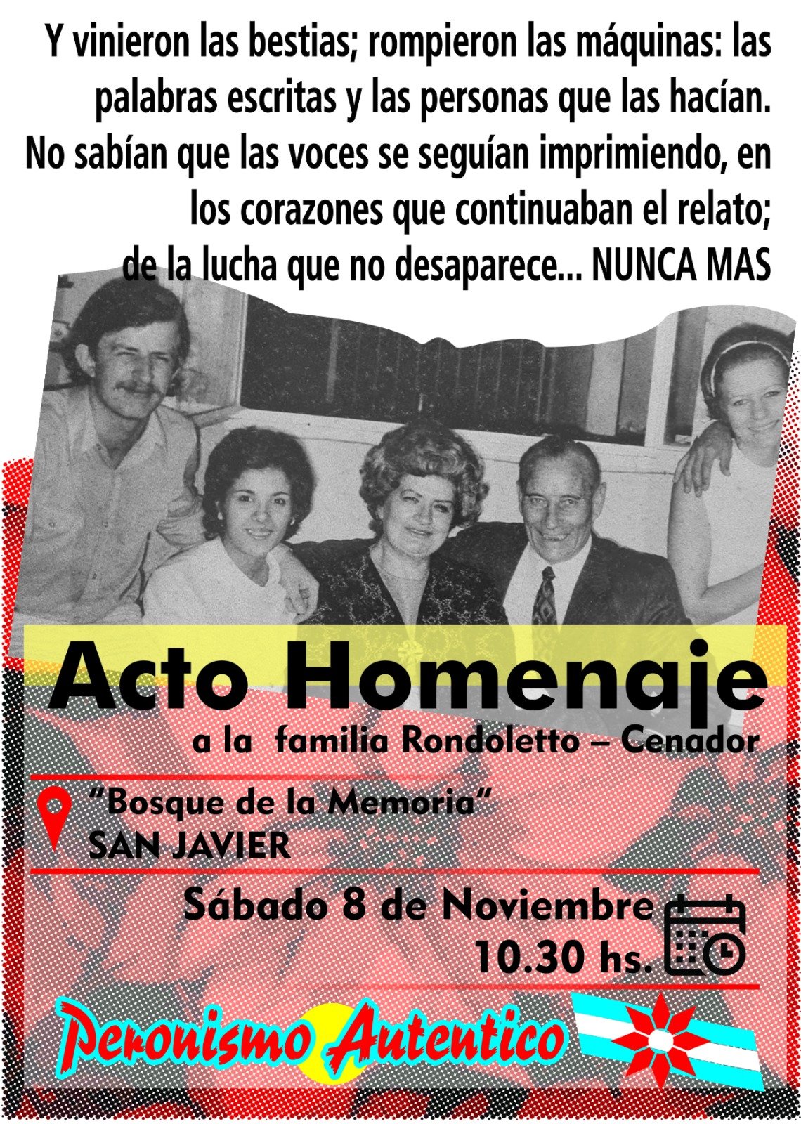 Desde Peronismo Auténtico convocamos a la comunidad a participar del Acto Homenaje de la Familia Rondoletto-Cenador Desaparecida el 2 de Noviembre de 1976.