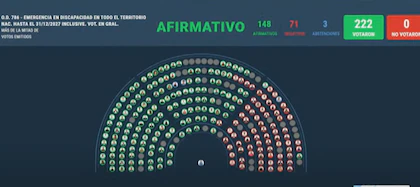 LaCámara de Diputados dio media sanción este jueves al proyecto de ley que declara laemergencia en discapacidaden todo el territorio nacional hasta el 31 de diciembre de 2027. Luego de más de una hora de debate, un total de 143 parlamentarios dieron su voto afirmativo a la iniciativa, contra otros 71 negativos y 3 abstenciones.