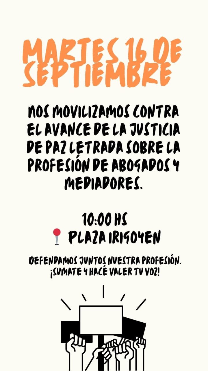 Este martes convocamos horas 10:00 en Plaza Yrigoyen a una marcha a realizarze entre Abogados Litigantes y Mediadores con Registro, ya que La Corte Suprema de Justicia viene avanzando hace mas de 2 años sobre la Profesión, en particular es este avance contra Derechos Constitucionales como la debida defensa en Juicio con respecto a la Justicia de Paz Letrada, que permite se realicen: Divorcios, alimentos provisorios, protecciones de personas y SUCESIONES sin intervención de Abogados patrocinantes. Además a partir del 1° de octubre quieren implementar MEDIACIONES sin intervención de abogados ni mediadores con registro.