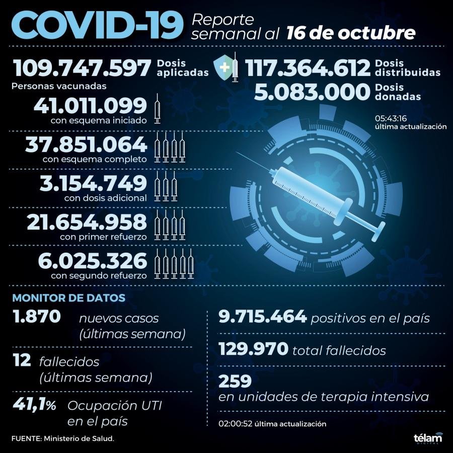 Según el Monitor Público de Vacunación, el total de dosis aplicadas asciende a 109.747.597, de los cuales 41.011.099 recibieron una dosis, 37.851.064 las dos, 3.154.749 una adicional, 21.654.958 el primer refuerzo, y 6.025.326 el segundo, mientras que las vacunas distribuidas a las jurisdicciones llegan a 117.364.612 y las donadas a 5.083.000./telam.com.ar